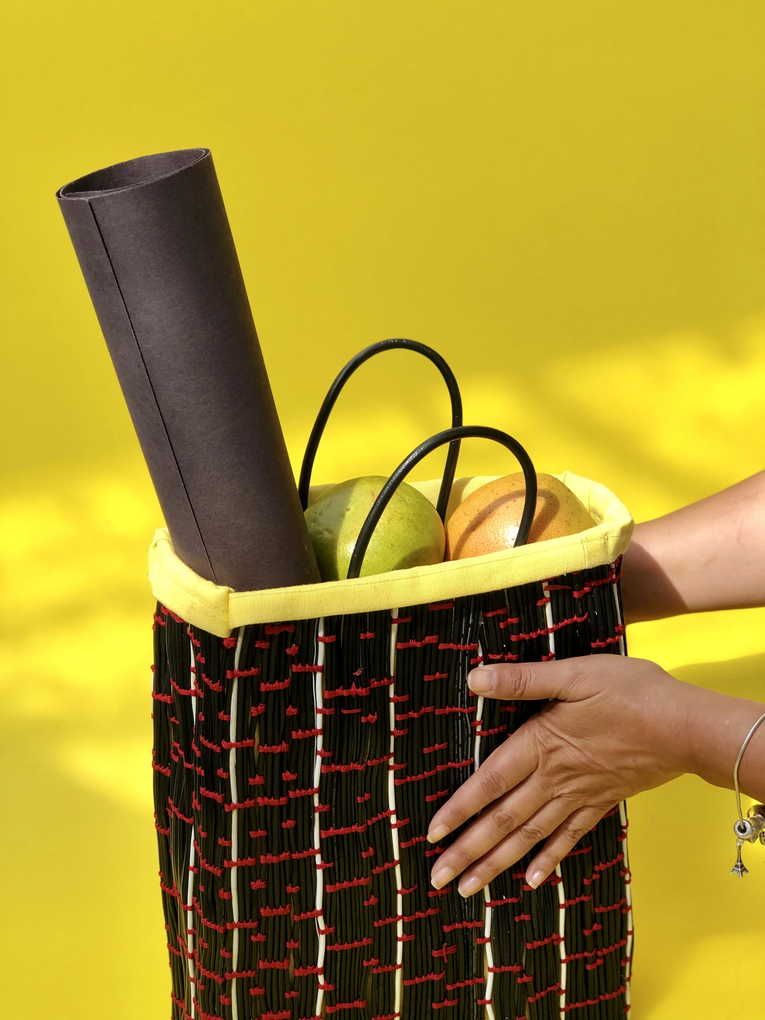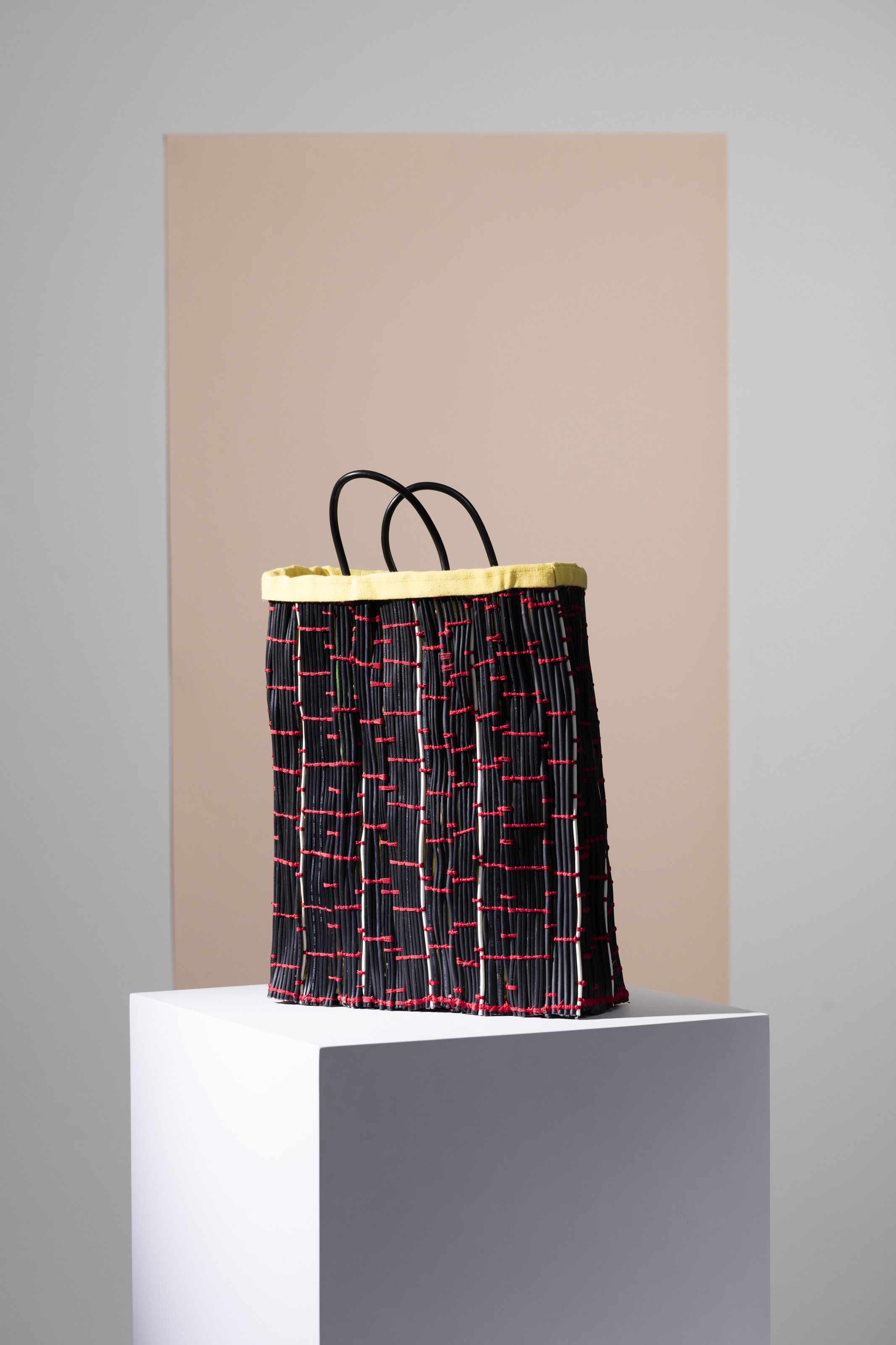 cable bag is a conscious-driven market bag made almost entirely of recycled computer and phone charger cables hand-woven with a red nylon thread, resulting in a textile proposal, whose main goal is to raise awareness about our role regarding the environmental impact that we are producing with the digital age, using waste as a raw material for creation.