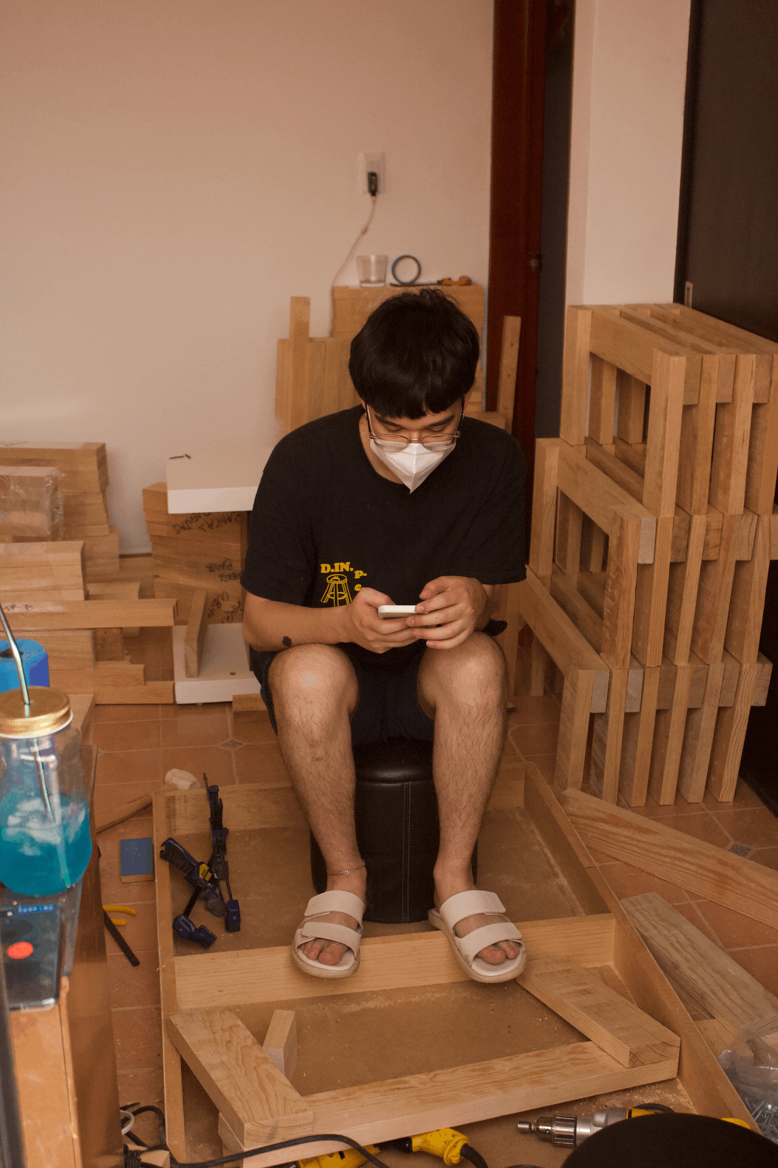 production of furniture in pine wood for fabien cappello / public space lago algo.